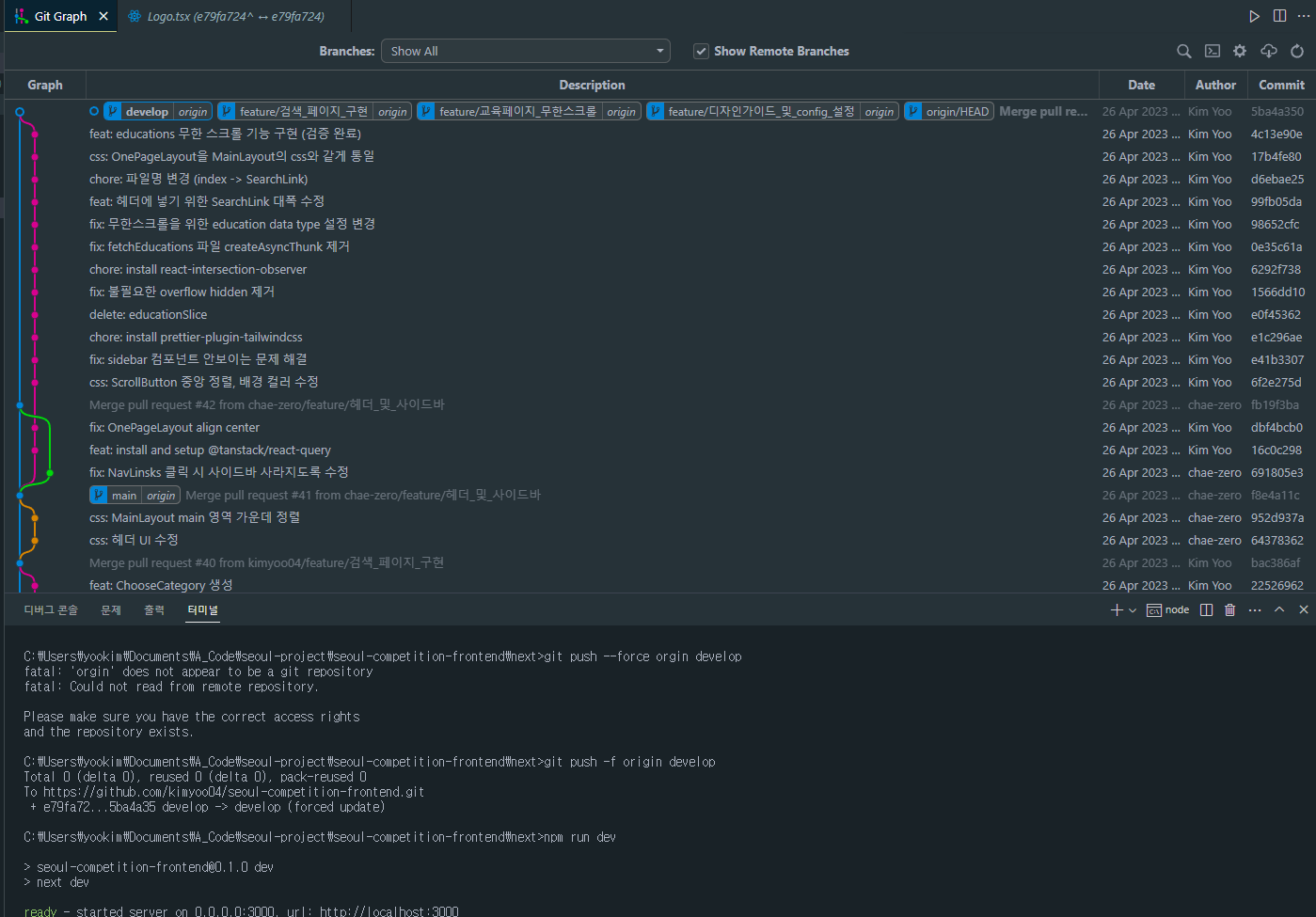 그 다음 git push -f origin <브랜치명> 을 통해서 origin의 기록도 일치 시켜줍니다. 제 계정이 upstream repository로 사용되고 있기 때문에 upstream이 아닌 origin입니다!