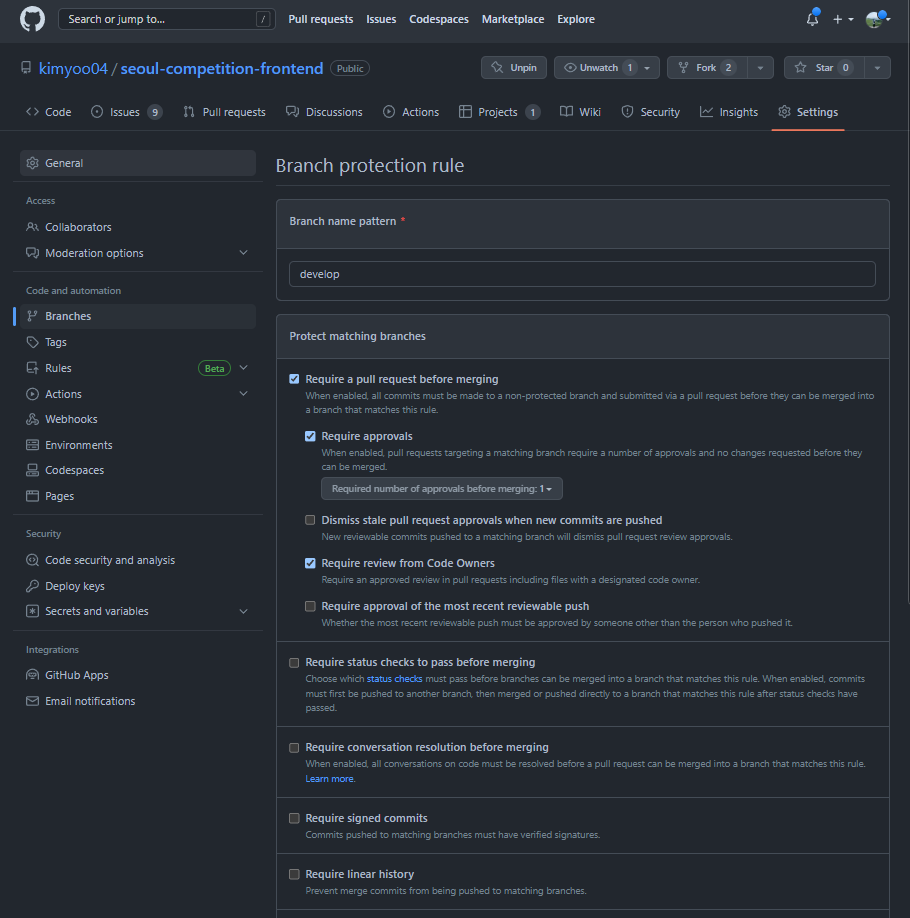 [ Branch protection rule 추가 ]