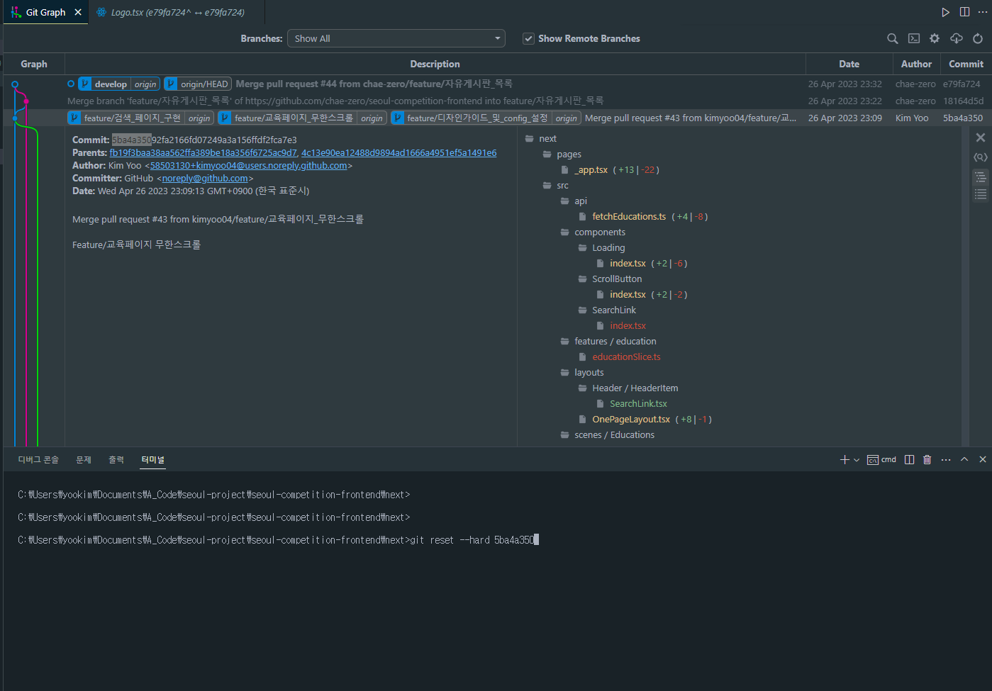 위의 이미지처럼 develop 브랜치가 제가 머지를 했었던 버전으로 돌아왔습니다.