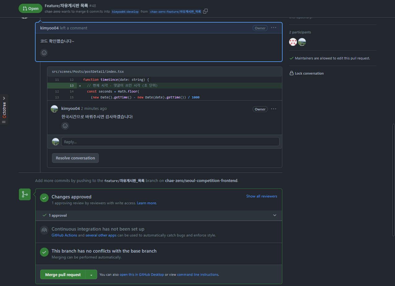 승인 기능을 사용하면서 처음 알게된 부분이 PR을 하고나서 merge를 안했다면 커밋을 추가하더라도 추가된 기록이 기존 open 된 PR에 기록이 되어진 다는 것입니다. 이것을 몰랐을 때는 항상 PR이미 해버렸다고 하면서 추가로 커밋을 하지 않고 머지 후에 추가작업을 했던 저를 반성했습니다 ^^;