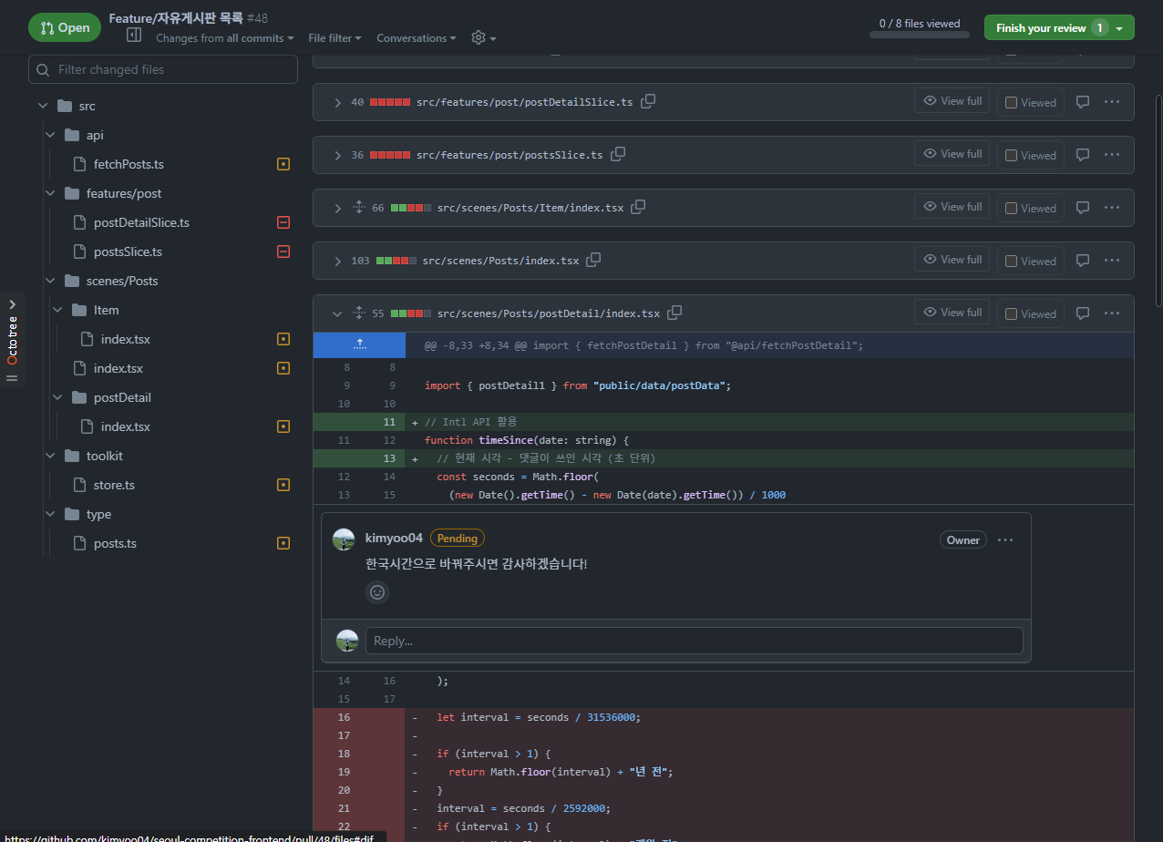 Viewed를 눌러두면 계속 기록이 저장되기 때문에 reviewer가 두고두고 몇일에 걸쳐서 리뷰를 한다면 본인이 이 코드를 봤는지 안봤는지 알아둘 필요가 있어서 저 Viewed 체크박스를 이용해서 코드리뷰가 필요한 파일들을 구분시키는 것이 매우 유용했습니다.