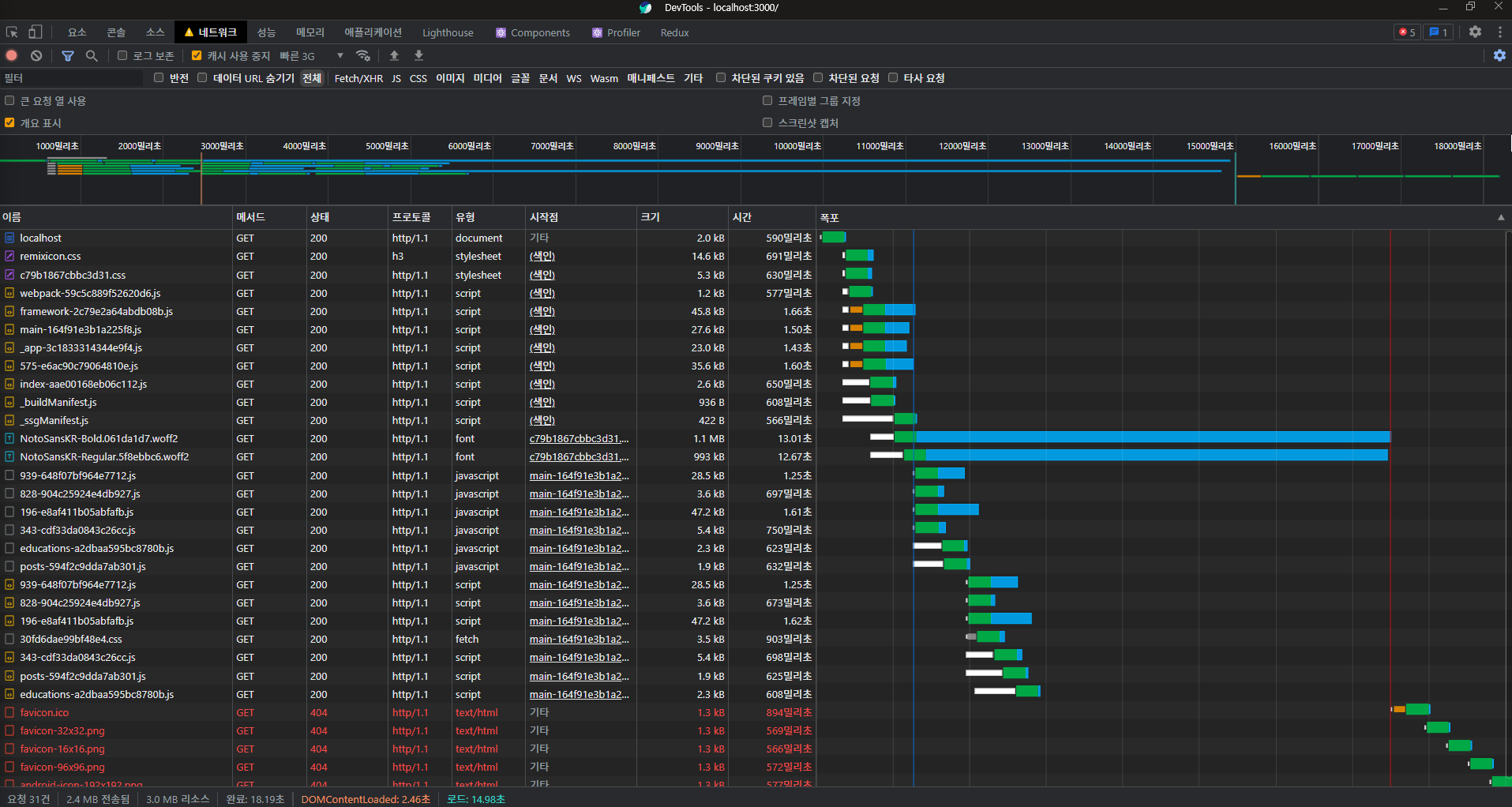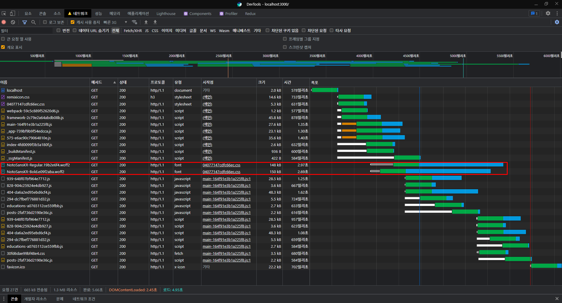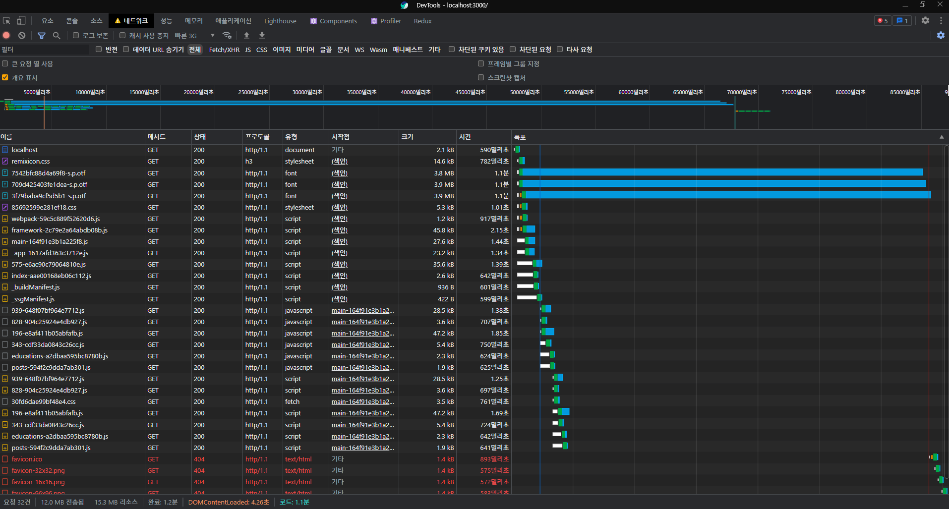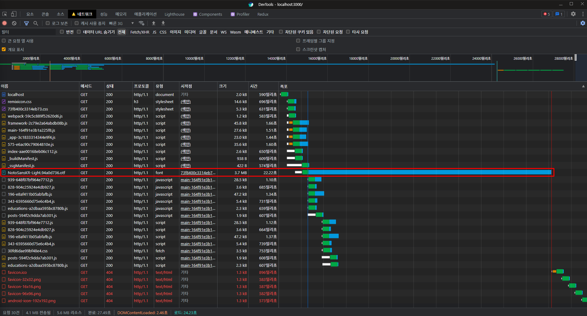 빠른 3G로 설정하고 받아왔을 때 유일하게 폰트가 혼자서 22.22초가 걸리는 것을 보고 너무 심하다는 것을 느꼈습니다. 그래서 이를 해결하는 방법을 고민했습니다. (현재 파비콘은 아직 코드만 넣고, png 파일을 넣지 않았습니다.)
