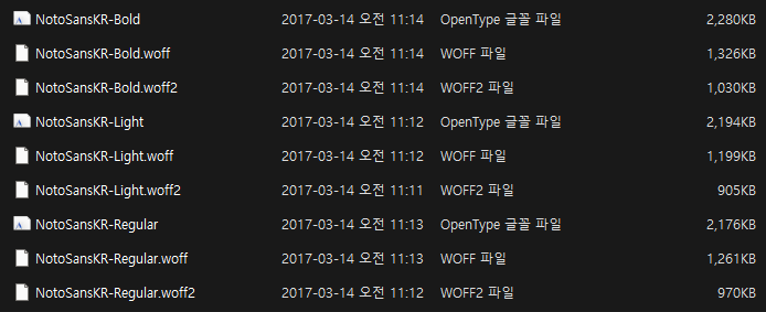 파일을 저장하고 보니 용량이 woff2파일보다 원본 파일에 비해서 10분의 1가량이 줄었습니다!