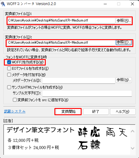위 이미지 처럼 체크하고 폰트 명 마다의 설정을 해주시면 됩니다. 자세한 버튼에 대한 설명은 제일 밑에 참조에 링크를 가보시면 있습니다! 제일 아래의 체크 버튼을 해두셨다면 WOFF와 WOFF2 확장저 컨버터 프로그램이 아래처럼 실행됩니다.