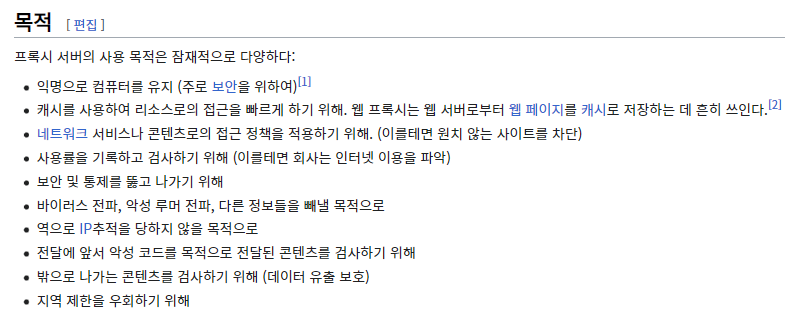 Proxy Server: proxy의 뜻 자체가 중계라는 뜻으로, Client와 Server 사이에서 요청과 응답을 관리하는 역할을 합니다.