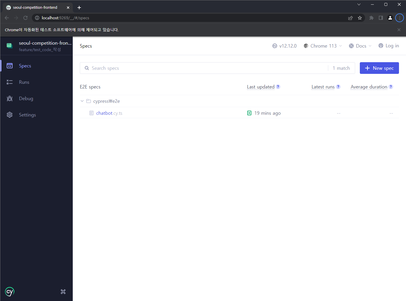이렇게 브라우저 창이 켜지면서 나오는 UI입니다! Create new spec을 누릅니다.