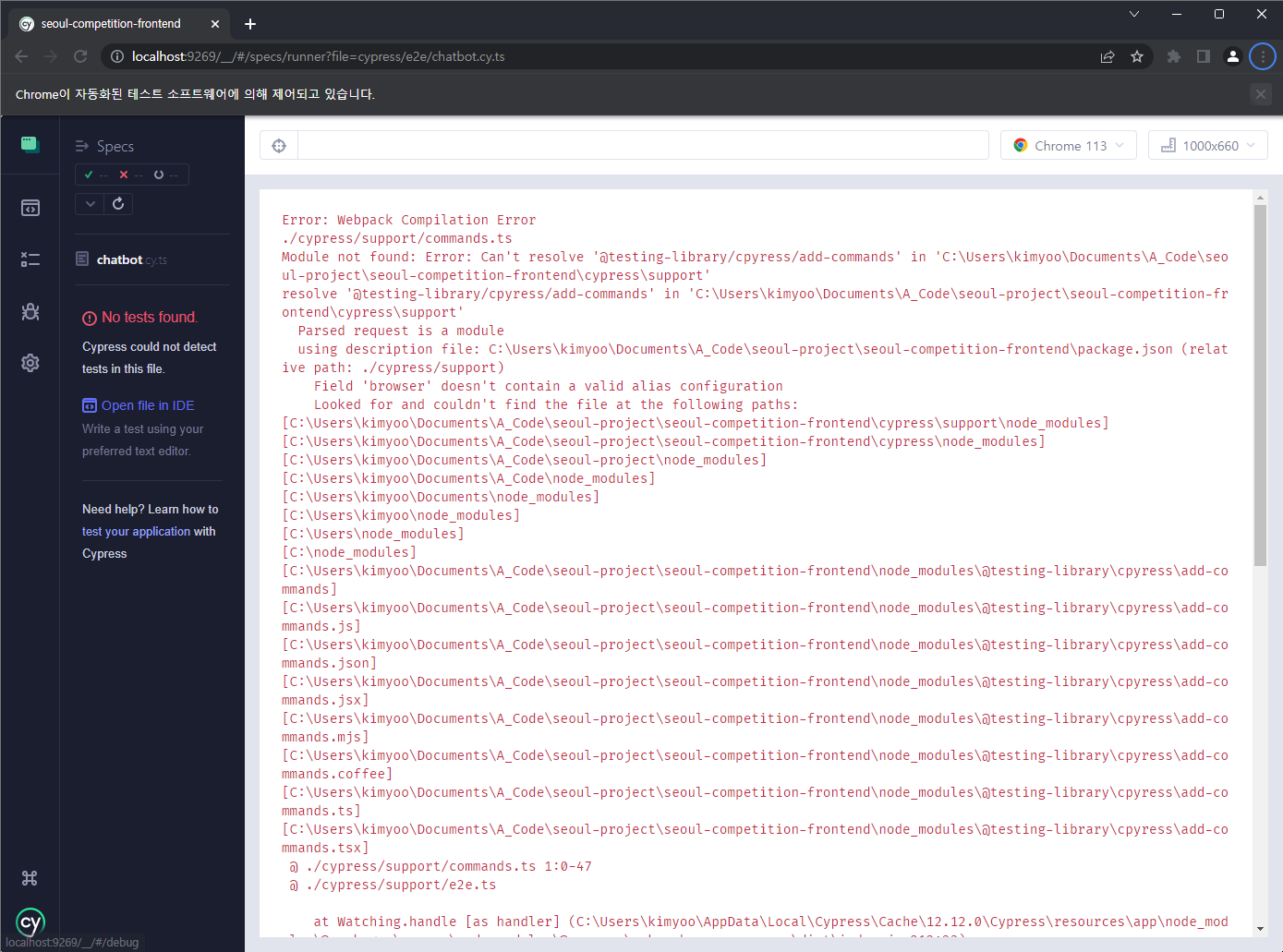 설치 및 실행 방법은 매우 간단합니다. npx cypress open을 하면 랜덤하게 포트번호를 선정하여 브라우저를 열어줍니다.