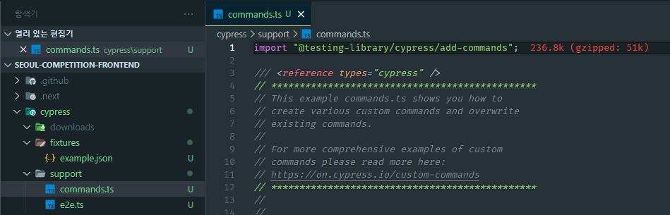 commands.ts 파일에 import "@testing-library/cpyress/add-commands";를 추가해줍니다.