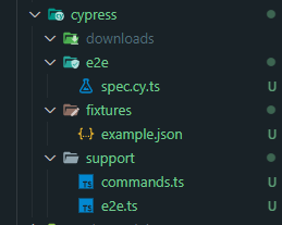 Cypress 기본적인 사용 방법, 주로 사용하는 함수 등 정리 Cypress 설치 시 기본 폴더 구조 (v10.6.0 기준) downloads 테스트 실행 중에 다운로드되는 파일이 보관됨. e2e e2e 테스트 파일들을 보관. fixtures 테